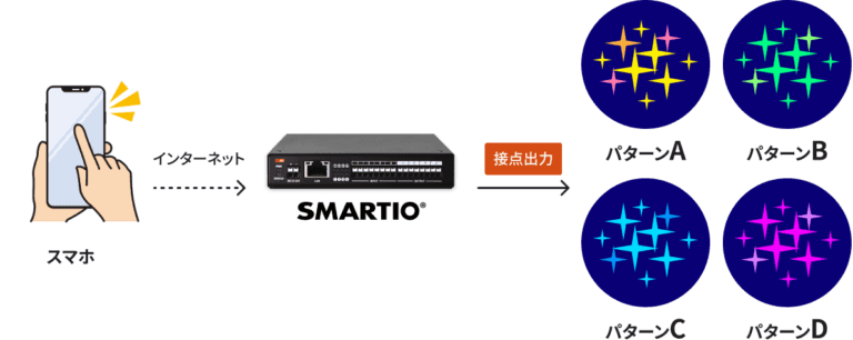 SMARTIOの各接点出力を異なる演出パターンに繋ぐことで、手元のスマートフォンからライトアップの演出パターンを切り替えることもできます。
