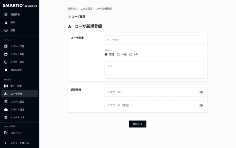 SMARTIOの管理画面「ユーザ管理」より、APIが実行可能なユーザを作成します。
