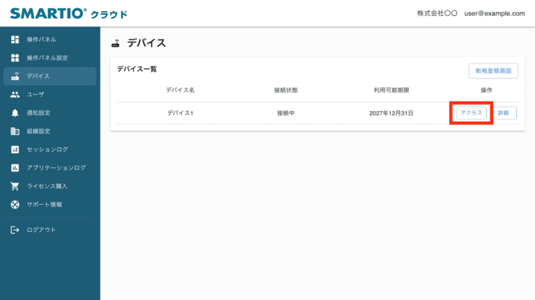 「デバイス」メニューから、遠隔操作したいデバイスを選び「アクセス」ボタンをクリックします。