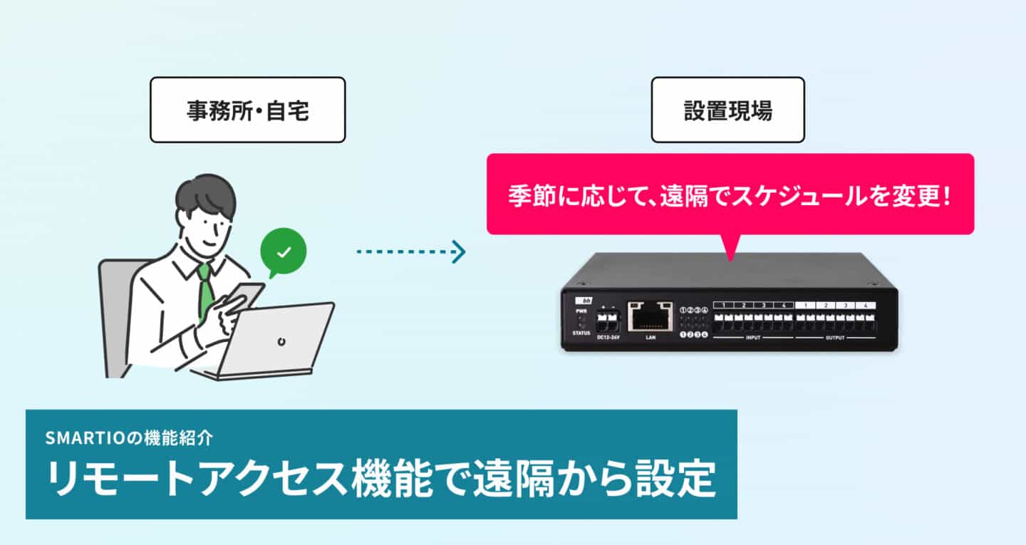 急なメンテナンスや休業、季節に応じたスケジュール変更も、現地に赴くことなく遠隔でタイムスケジュールやトリガー設定を切り替えられます。SMARTIOはNTPサーバーから正確な時刻を取得するので、遠隔制御でスケジュールを変更できるタイムスイッチとしても活用可能です。