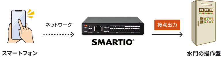 SMARTIOは、既存の水門設備の遠隔操作にもご利用いただけます。本製品は、デジタル入力4点・デジタル出力4点を備えたリモート設備制御装置で、制御室や操作盤の接点に接続することで水門の遠隔操作を可能にします。