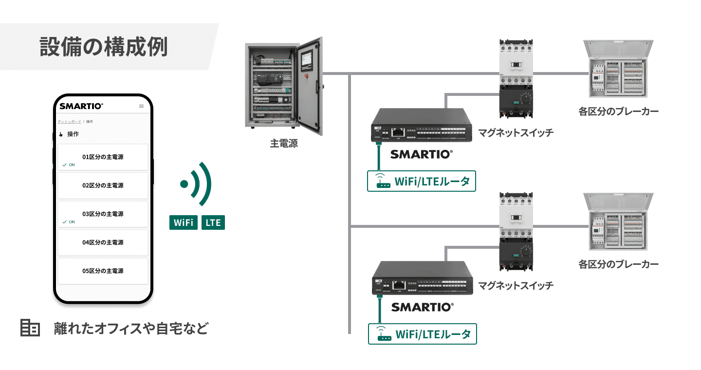 各部屋や区画の分電盤内にマグネットスイッチ(電磁開閉器)を取り付け、SMARTIOで制御する方法があります。これにより主電源系統を遠隔でON/OFFし、夜間や利用時間外の不要な電力消費を削減します。スマートフォンやPCから電源状態を確認でき、巡回作業の負担も軽減できます。