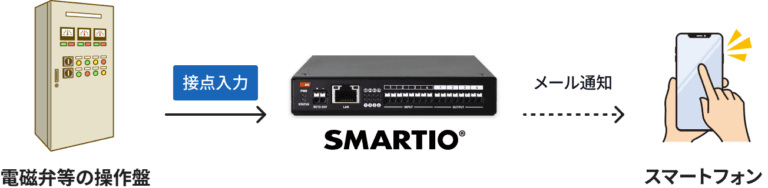 この他にも、SMARTIOの入力をに操作盤の回転灯用の無電圧接点端子を接続すれば、異常が発生した際にメール通知を受け取りつつ、スマホから遠隔で操作して対応することも可能になります。