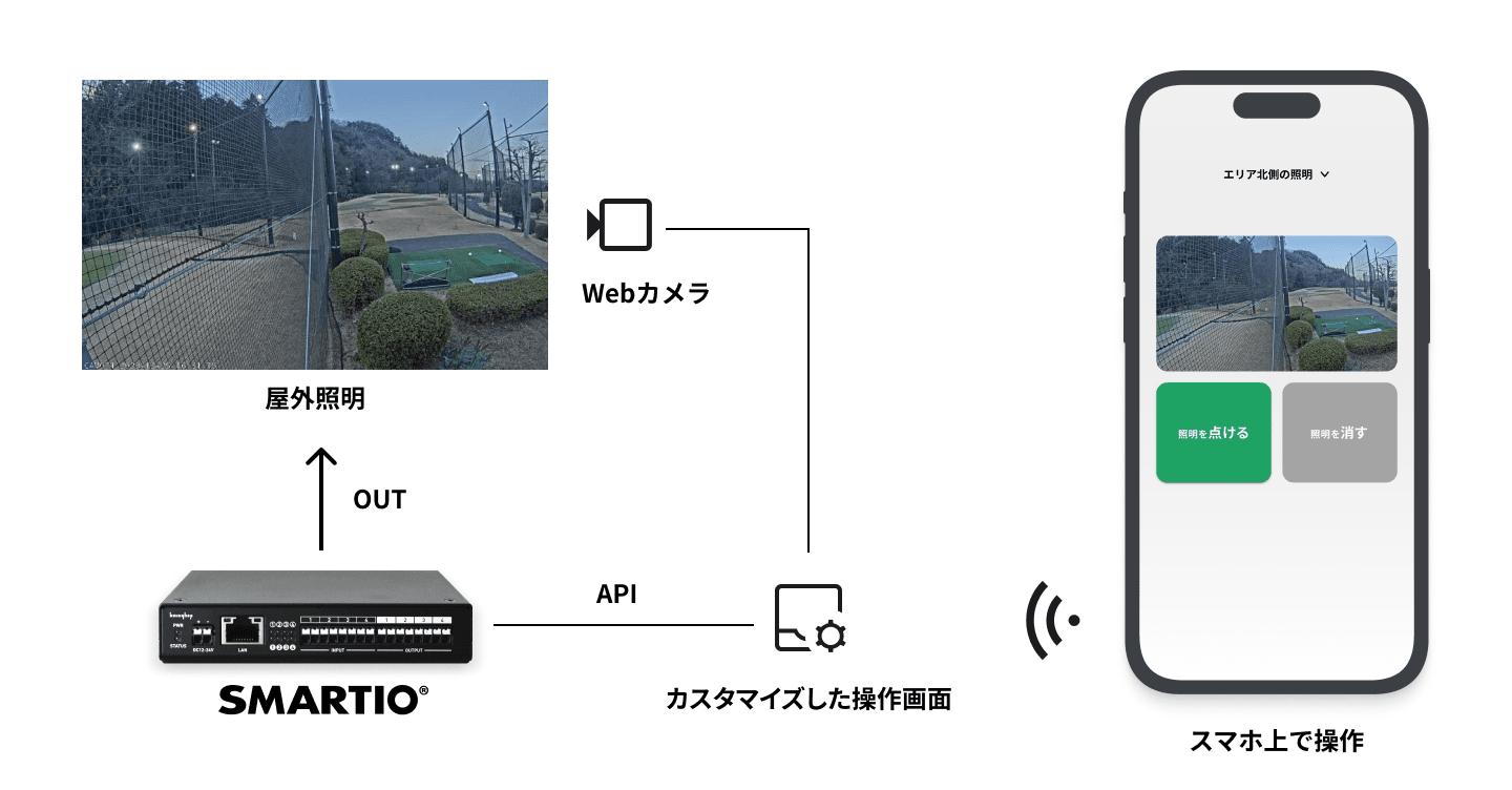 従来は、グラウンドまで照明の点灯・消灯のために移動する必要がありましたが、スマートフォンやPCからWebブラウザ画面にアクセスし、現場の映像を確認しながら操作が可能になります。
