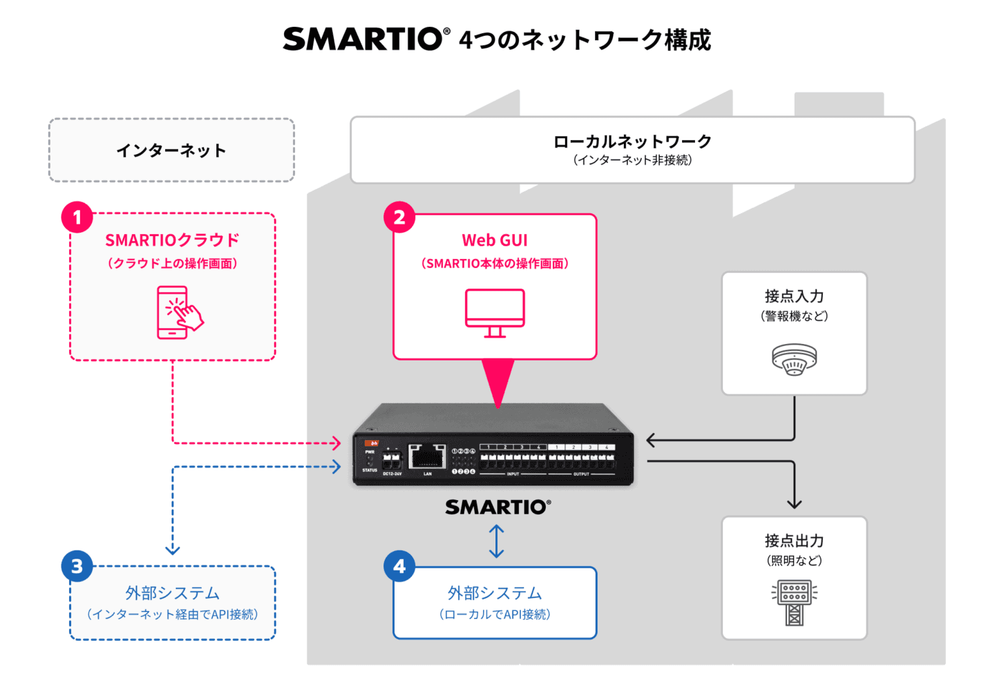 (電気設備の多くは「接点」という制御用端子を備えています。例えば自動ドアでは、押しボタンや人感センサーを接点端子に接続して動作させます。SMARTIOは、4つの接点出力端子と4つの接点入力端子を搭載し、インターネット経由で接点の操作ができます。)